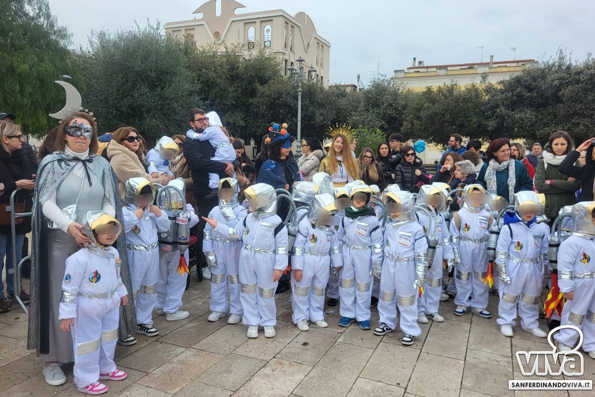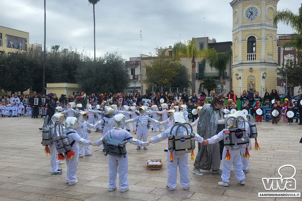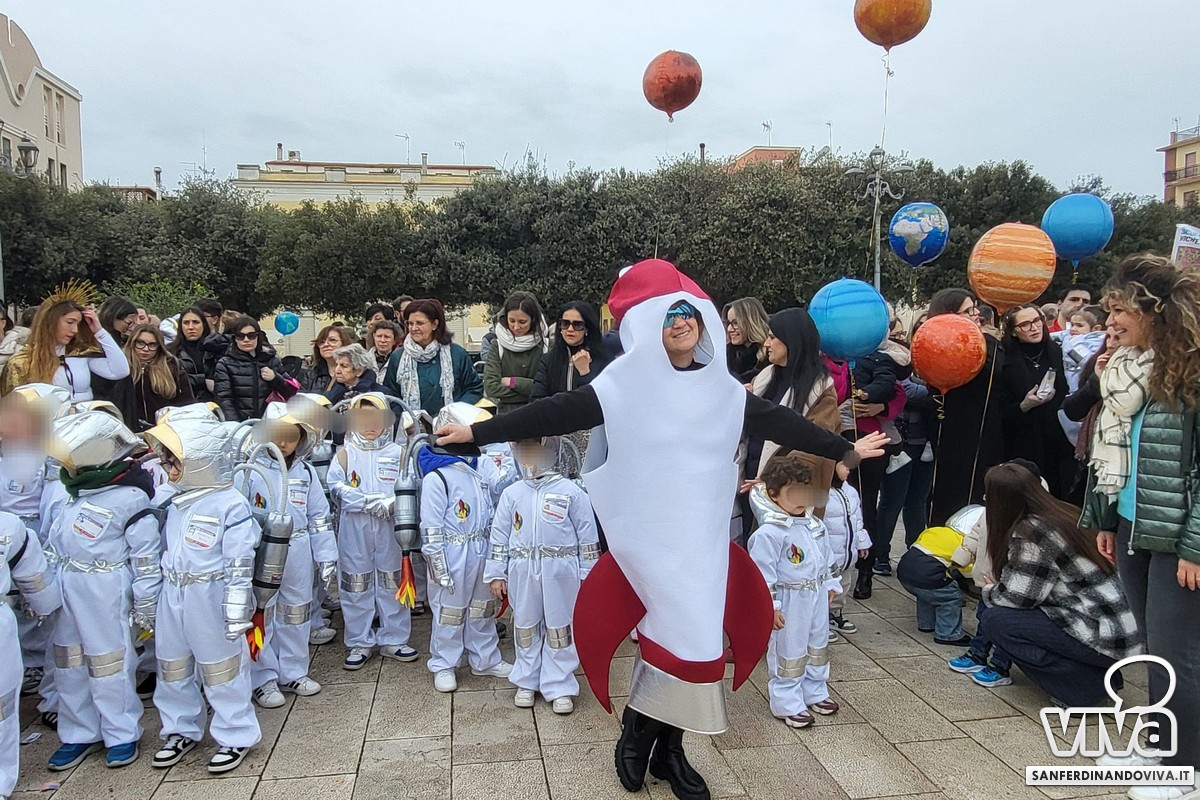C'erano bambini vestiti da astronauta per rappresentare lo sbarco sulla Luna – avvenuto nel 1969 – e i viaggiatori nello spazio: spettacolari anche le maschere delle maestre, rappresentanti stelle e razzi.