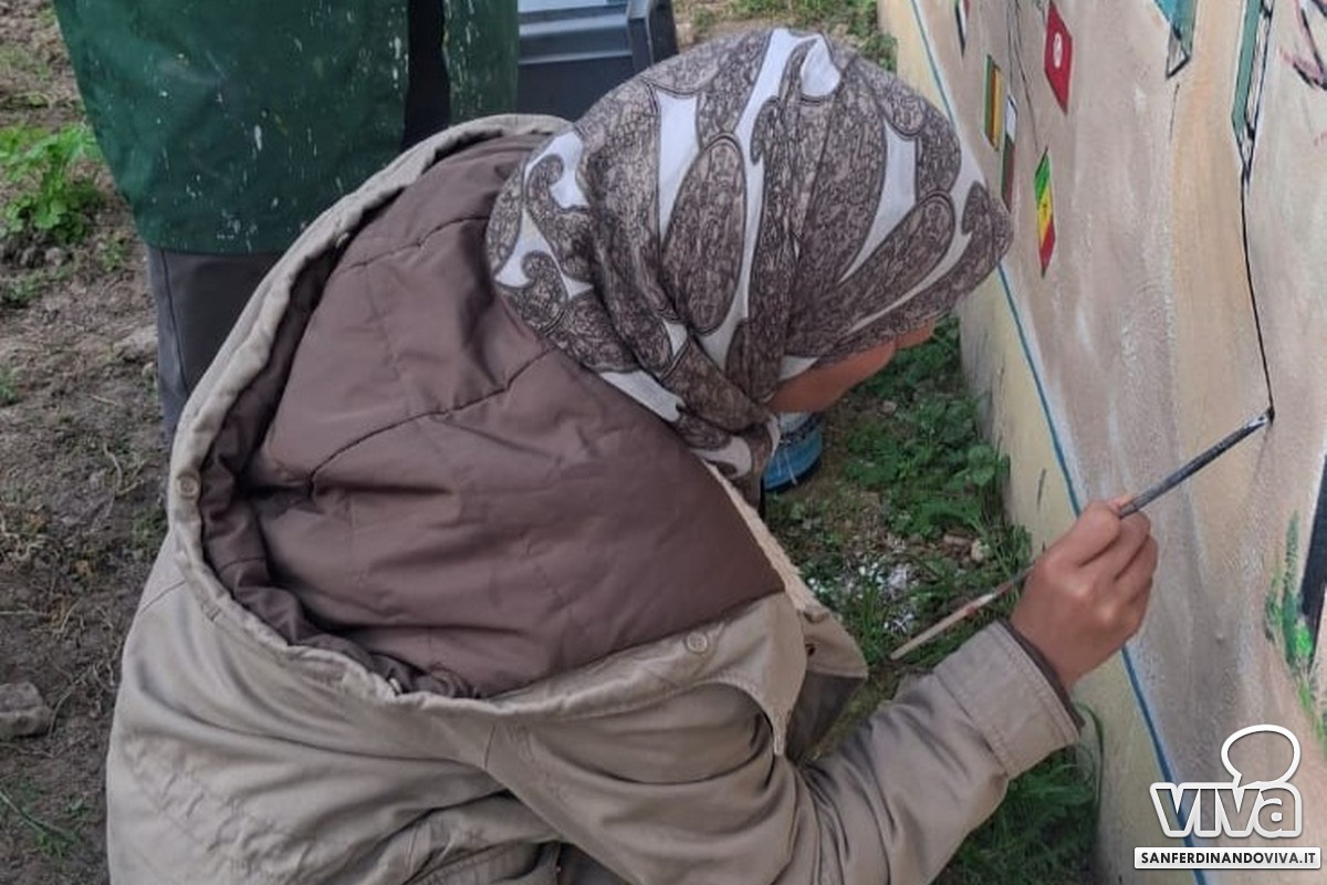 «Sempre nell'orto è stato fatto un murales – da Stella, in collaborazione con i ragazzi - dedicato agli stessi ragazzi e ai bambini, dato che condividiamo lo spazio con una scuola dell'infanzia e questo murales racconta il percorso che fanno questi ragazzi per fuggire dalle guerre e dallo sfruttamento delle varie sofferenze, poi arrivano a scuola, alle radici ci sono tutte le bandiere e quindi le varie nazionalità, per poi arrivare alla pace rappresentata da un arcobaleno e da degli aquiloni».