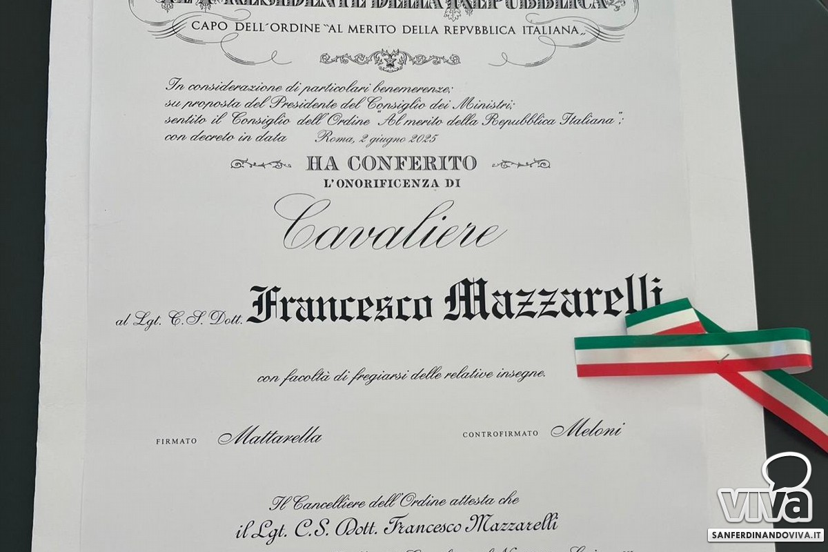 Il sanferdinandese Francesco Mazzarelli insignito dell’onorificenza di Cavaliere