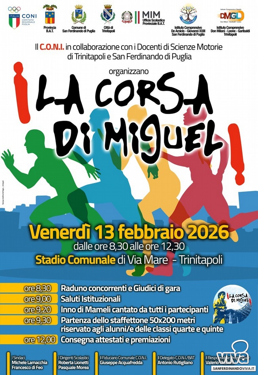 Venerdì 13 febbraio lo stadio comunale di via Mare a Trinitapoli si terrà la quarta tappa del "La Corsa di Miguel", la stessa è inserita nel progetto "Lo Sport è un Mappamondo" ideata da Valerio Piccioni, giornalista della Gazzetta dello Sport. Tale attività è stata presentata in 34 seminari tenutosi, in tutte le scuole che hanno aderito, da Antonio Rutigliano (delegato CONIBAT) e dal giornalista dal 4 novembre 2025 al 30 gennaio 2026.