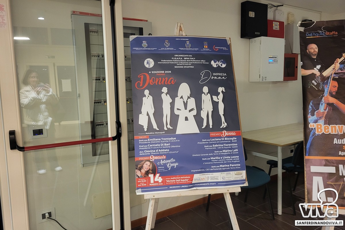 L'evento è stato organizzato dall'associazione F.I.D.A.P.A. – BPW ITALY (Federazione Italiana Donne Arti Professioni Affari) della sezione ofantina con la presenza e i saluti della dott.ssa Emiliana Trentadue (Presidente Distretto Sud-Est F.I.D.A.P.A.), della prof.ssa Carmela Di Bari (Presidente F.I.D.A.P.A. Sezione Ofantina) e dell'avv. Giovina D'Addato (referente "Premio Donna F.I.D.A.P.A.). Il tutto in collaborazione con la scuola 'Dell'Aquila-Staffa', la scuola 'Aldo Moro' di Margherita di Savoia, la Bcc Canosa Loconia, la Global Project ing. Salvatore Simone, impresa Leuce, Litografia Gt.